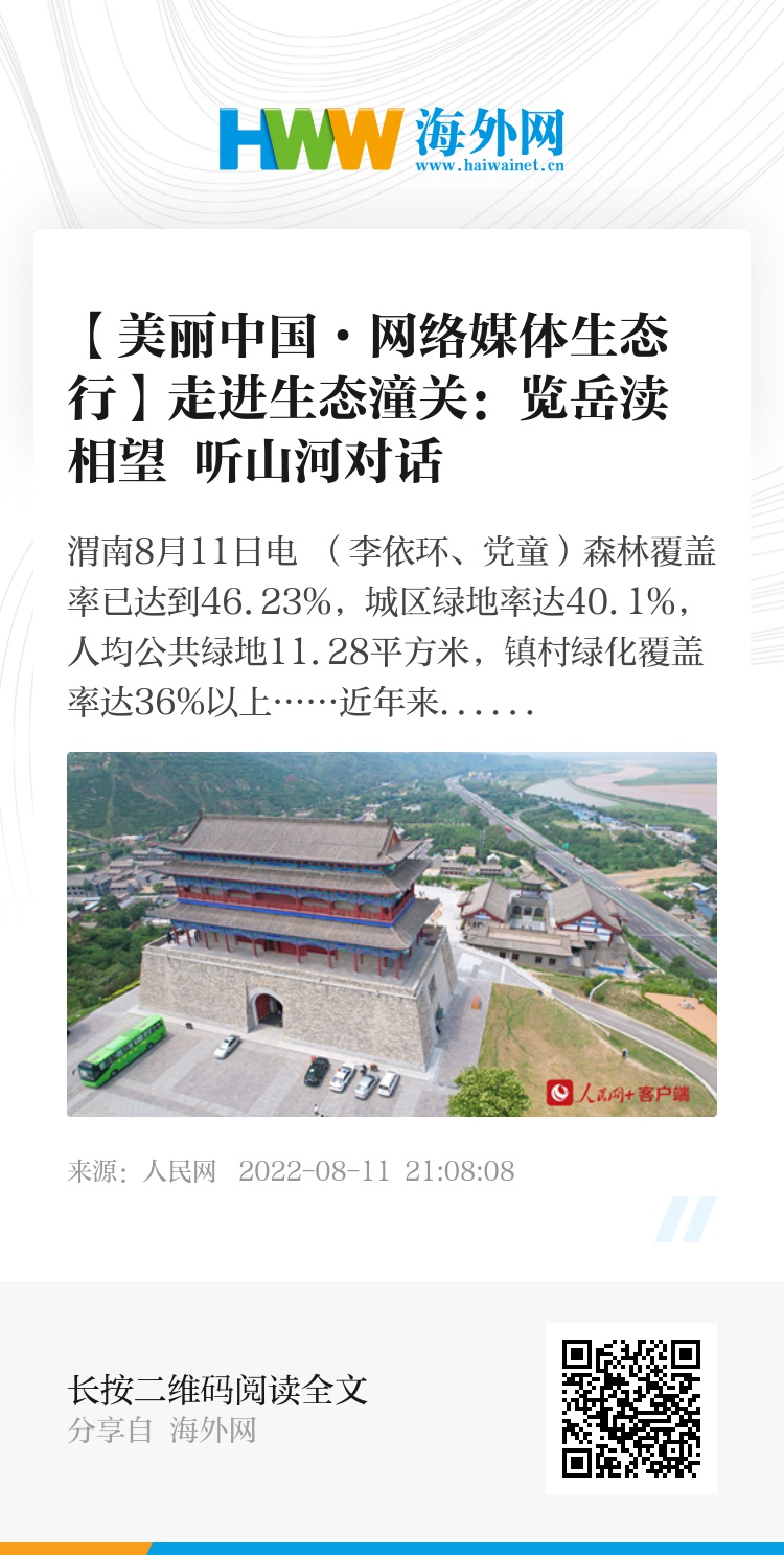 人民网渭南8月11日电 (李依环、党童)森林覆盖率已达到46.23%,城区绿地率达40.1%,人均公共绿地11.28平方米,镇村绿化覆盖率达36%以上……近年来,作为陕西的“东大门”,潼关着力厚植高质量发展的生态底色,一串串数字也勾勒出了这座古城的向“绿”而行之路。