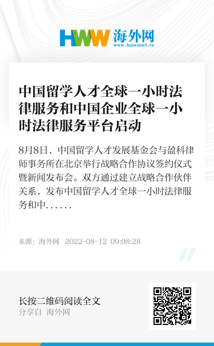 8月8日,中国留学人才发展基金会与盈科律师事务所在北京举行战略合作协议签约仪式暨新闻发布会。双方通过建立战略合作伙伴关系,发布中国留学人才全球一小时法律服务和中国企业全球一小时法律服务平台,充分发挥各自优势,为全球留学人员和企业提供紧急法律援助和专业法律服务,为进一步推动我国留学人员工作健康有序开展贡献力量。