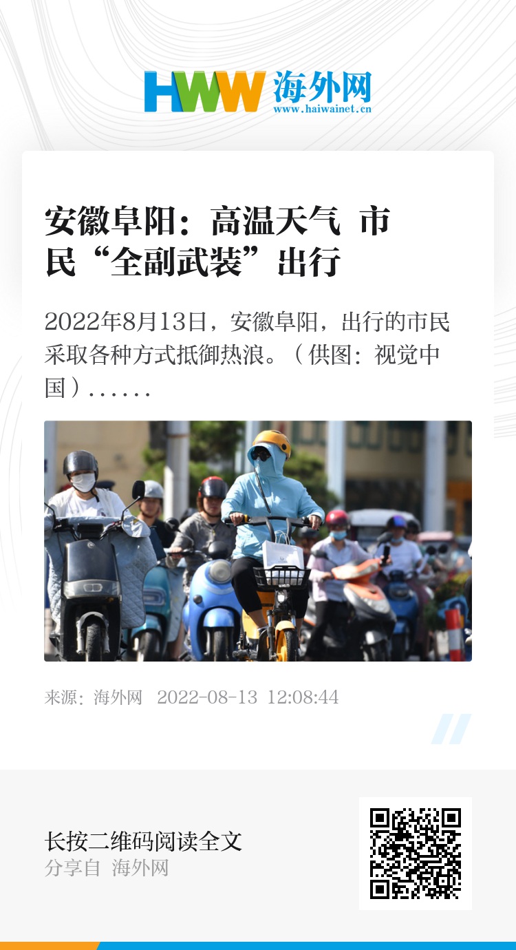 32470617,.安徽阜阳:高温天气 市民“全副武装”出行,.2022-08-13 12:40:44,.204198,.侯兴川