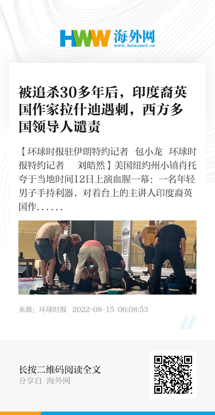 【环球时报驻伊朗特约记者 包小龙 环球时报特约记者 刘皓然】美国纽约州小镇肖托夸于当地时间12日上演血腥一幕:一名年轻男子手持利器,对着台上的主讲人印度裔英国作家萨尔曼·拉什迪猛刺数下,后者当场被捅成重伤,倒在血泊之中。