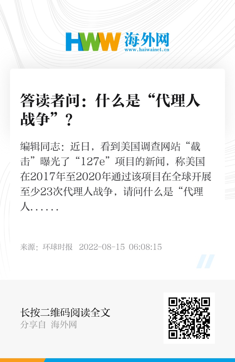近日,看到美国调查网站“截击”曝光了“127e”项目的新闻,称美国在2017年至2020年通过该项目在全球开展至少23次代理人战争,请问什么是“代理人战争”?