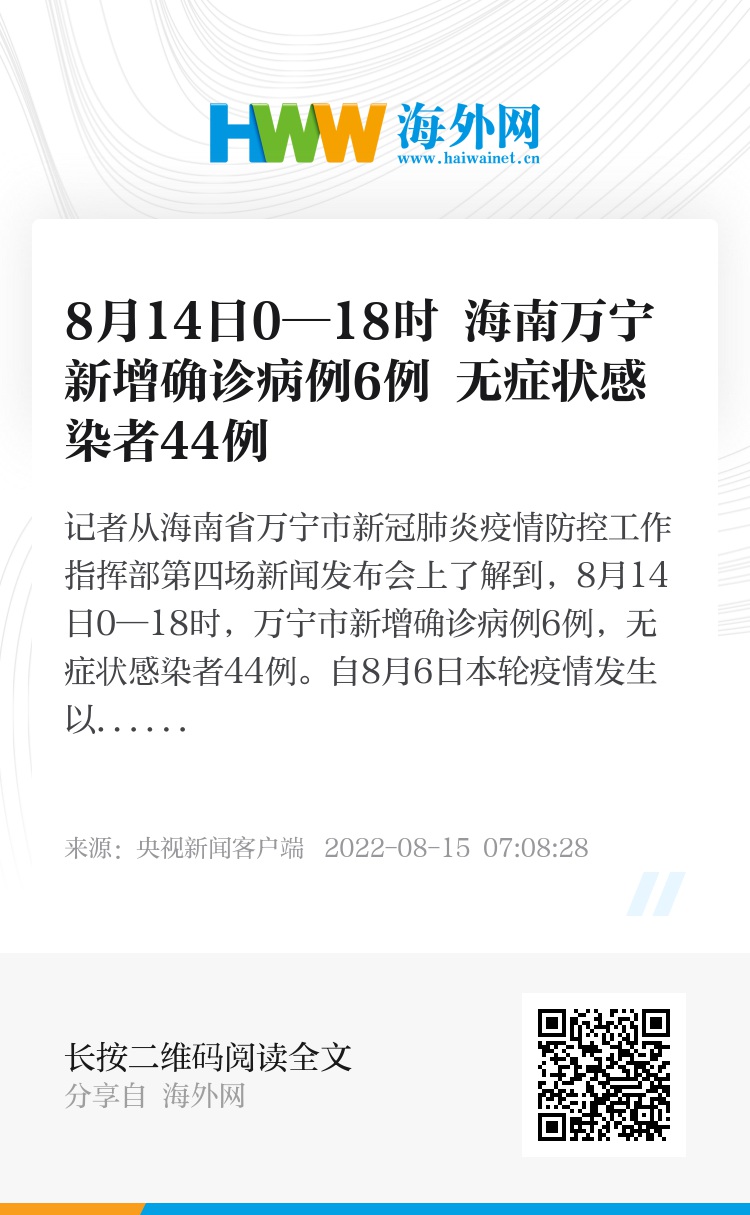 根据海南省疫情防控工作指挥部统一部署要求,8月15日上午万宁市将启动第八轮全员核酸检测,进一步织密疫情防控网。
