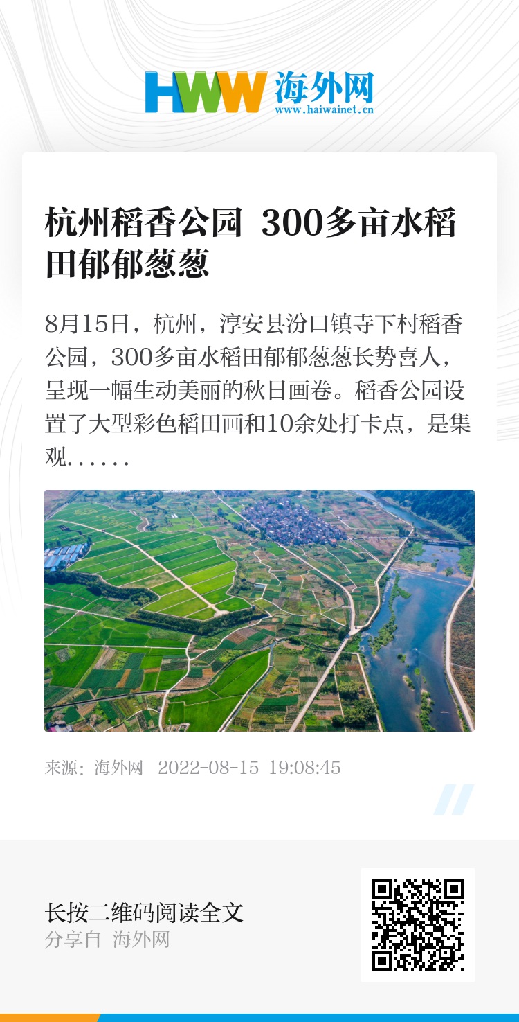 8月15日,杭州,淳安县汾口镇寺下村稻香公园,300多亩水稻田郁郁葱葱长势喜人,呈现一幅生动美丽的秋日画卷。稻香公园设置了大型彩色稻田画和10余处打卡点,是集观光、科普、休闲为一体的稻香生态公园。图片来源:视觉中国