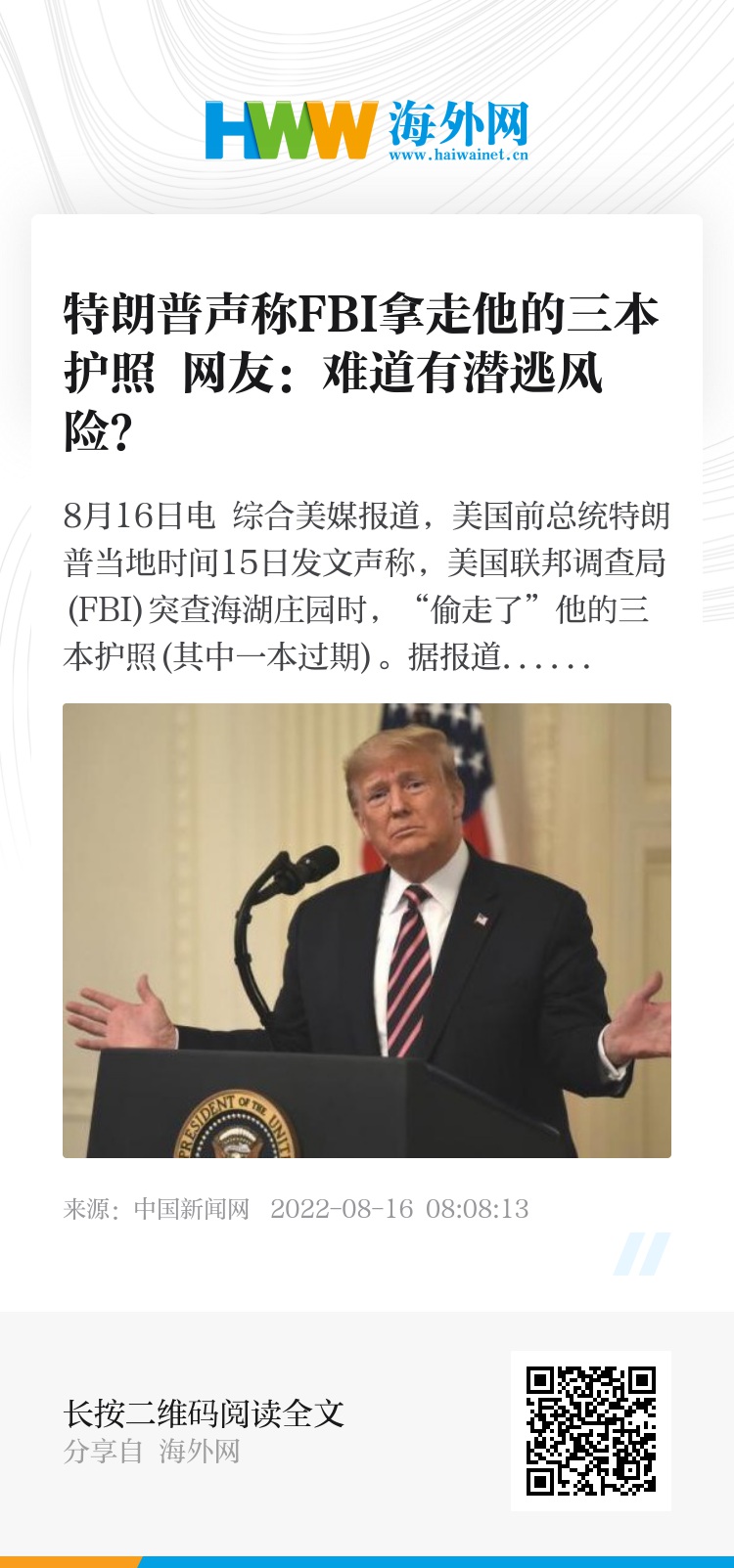 中新网8月16日电 综合美媒报道,美国前总统特朗普当地时间15日发文声称,美国联邦调查局(FBI)突查海湖庄园时,“偷走了”他的三本护照(其中一本过期)。