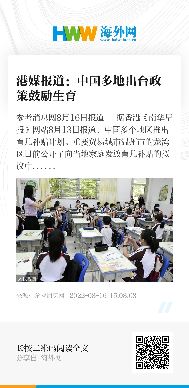 参考消息网8月16日报道 据香港《南华早报》网站8月13日报道,中国多个地区推出育儿补贴计划。