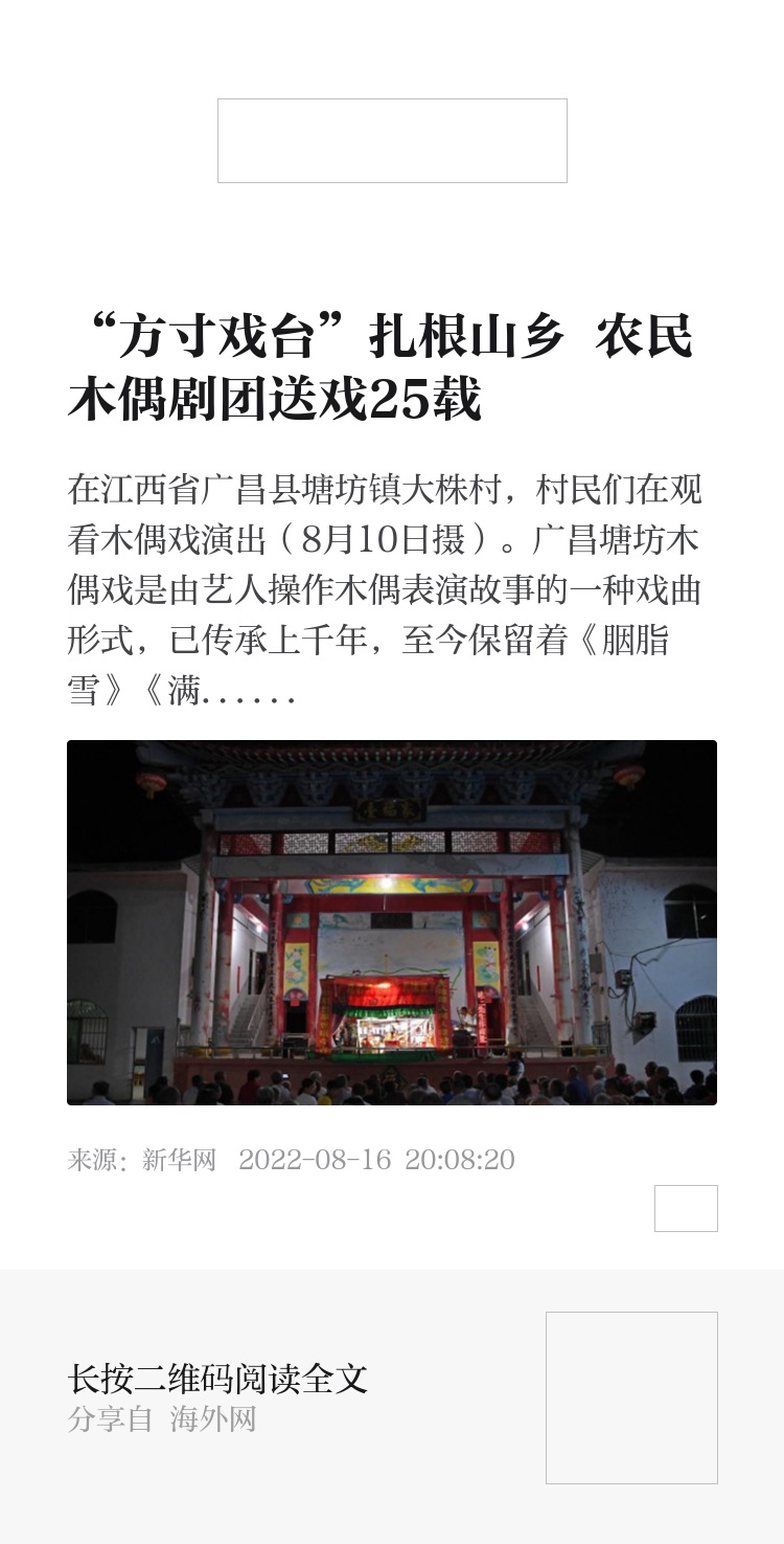 在江西省广昌县塘坊镇大株村,村民们在观看木偶戏演出(8月10日摄)。广昌塘坊木偶戏是由艺人操作木偶表演故事的一种戏曲形式,已传承上千年,至今保留着《胭脂雪》《满堂福》等30多个传统剧目,于2013年被列入江西省非物质文化遗产名录。 新华社记者 万象 摄