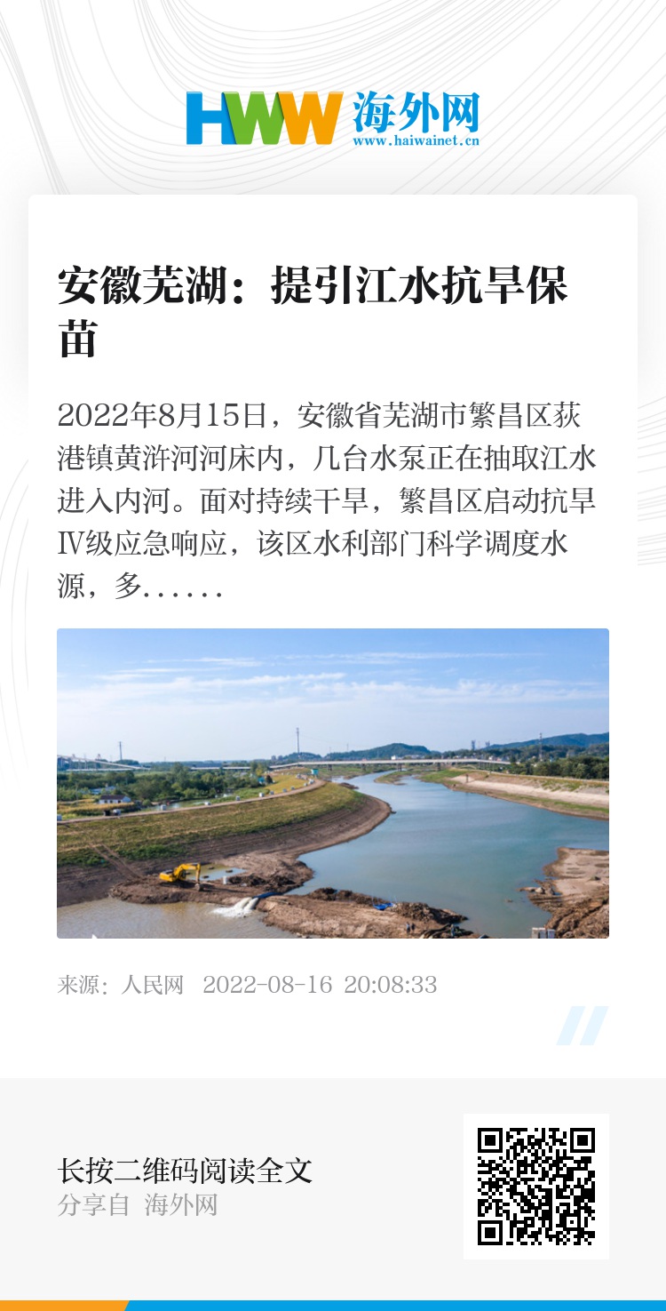 2022年8月15日,安徽省芜湖市繁昌区荻港镇黄浒河河床内,几台水泵正在抽取江水进入内河。面对持续干旱,繁昌区启动抗旱Ⅳ级应急响应,该区水利部门科学调度水源,多措并举、多管齐下,提引长江水源补充内水,助力农业抗旱,为保障粮食安全提供强有力的水利支撑。肖本祥摄(人民图片网)