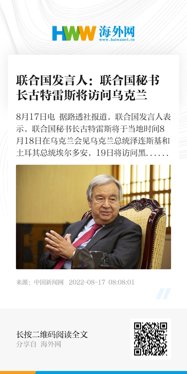 中新网8月17日电 据路透社报道,联合国发言人表示,联合国秘书长古特雷斯将于当地时间8月18日在乌克兰会见乌克兰总统泽连斯基和土耳其总统埃尔多安,19日将访问黑海港口敖德萨港。