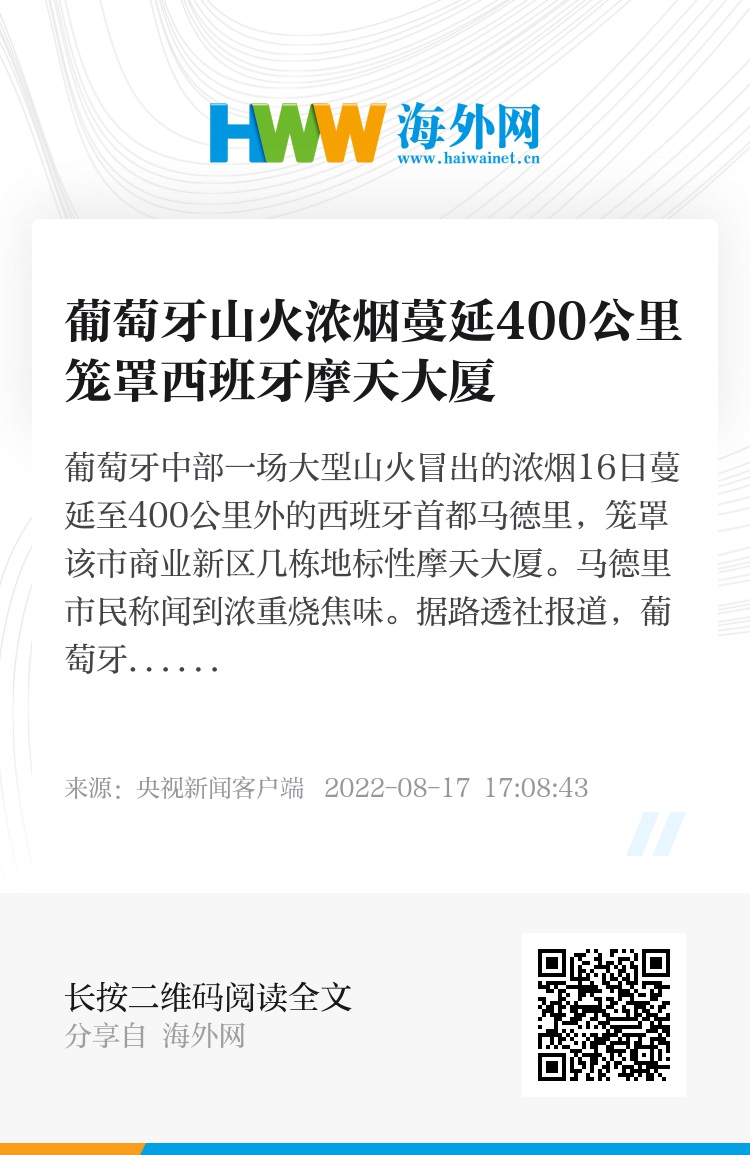 葡萄牙中部一场大型山火冒出的浓烟16日蔓延至400公里外的西班牙首都马德里,笼罩该市商业新区几栋地标性摩天大厦。马德里市民称闻到浓重烧焦味。