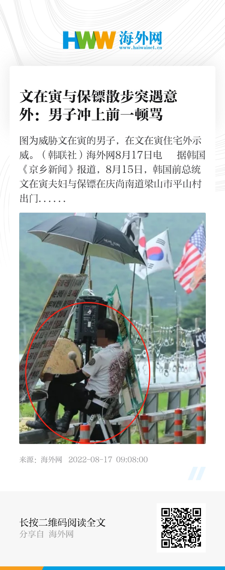 海外网8月17日电 据韩国《京乡新闻》报道,8月15日,韩国前总统文在寅夫妇与保镖在庆尚南道梁山市平山村出门散步时,一名男子上前对其威胁辱骂。这是文在寅卸任返乡后,首次在村里散步。