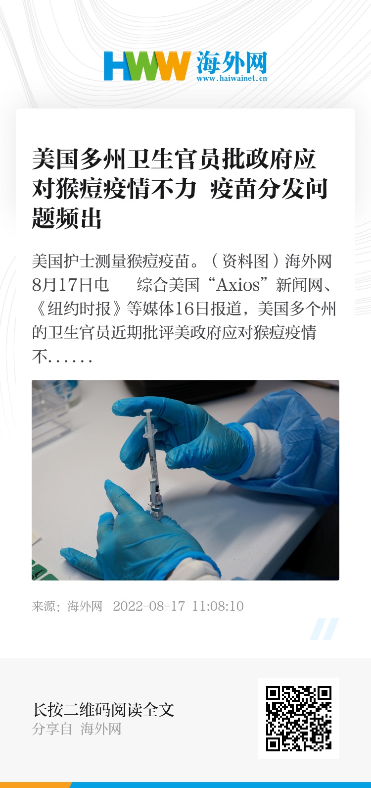海外网8月17日电 综合美国“Axios”新闻网、《纽约时报》等媒体16日报道,美国多个州的卫生官员近期批评美政府应对猴痘疫情不力,原因在于猴痘疫苗分发系统频频出现问题、民众迟迟无法接种疫苗。