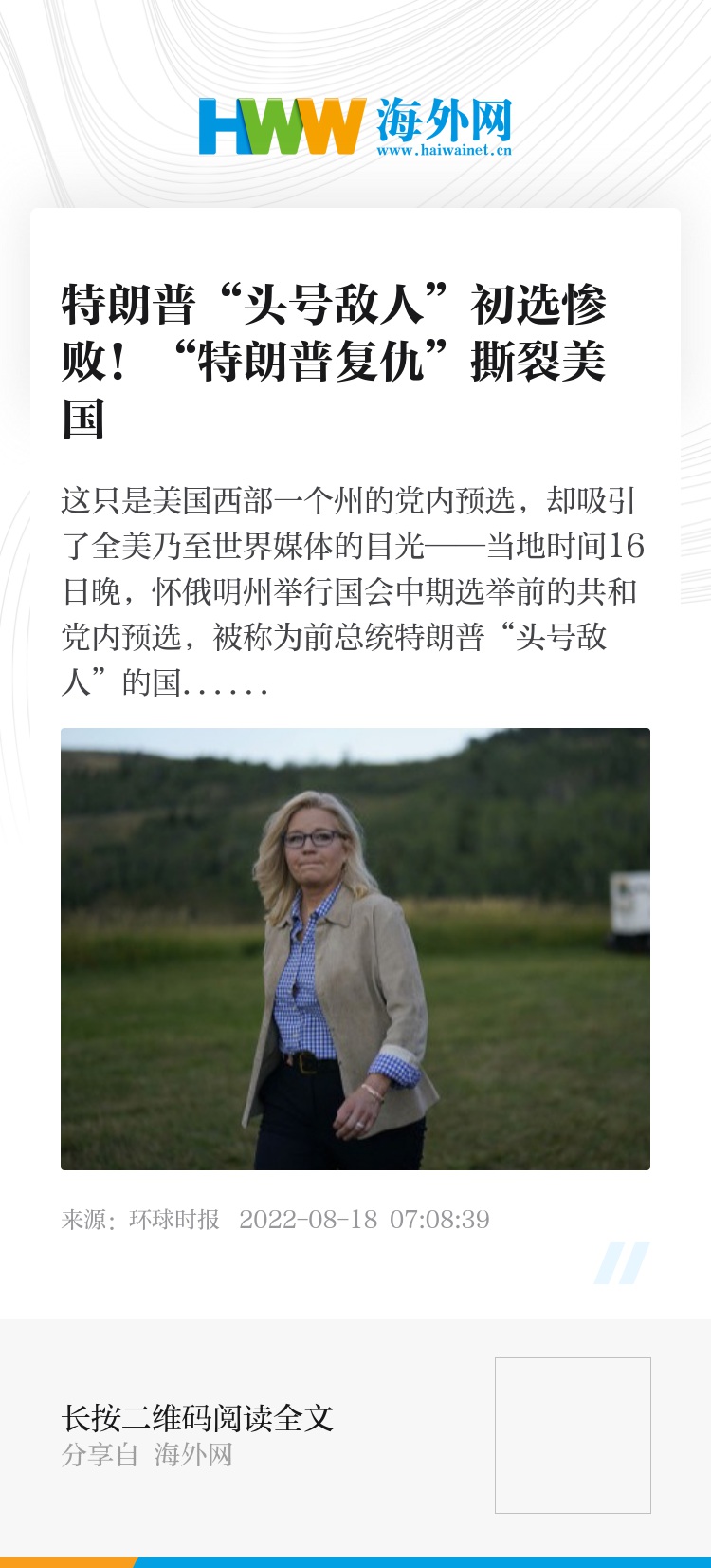 美国几乎所有主流媒体16日晚都在直播怀俄明州共和党内的这场初选。尽管之前的民调显示切尼会落败,但当她以29%的支持率惨败给特朗普点名支持的竞选人哈丽雅特·哈格曼66%的支持率时,媒体还是发出一片唏嘘。《纽约时报》称,在得到特朗普背书之前,哈格曼几乎没有政治追随者。“在众议院选举中,现任议员通常能轻松获胜。没有任何一次失败像切尼的失败那样具有重大意义。”