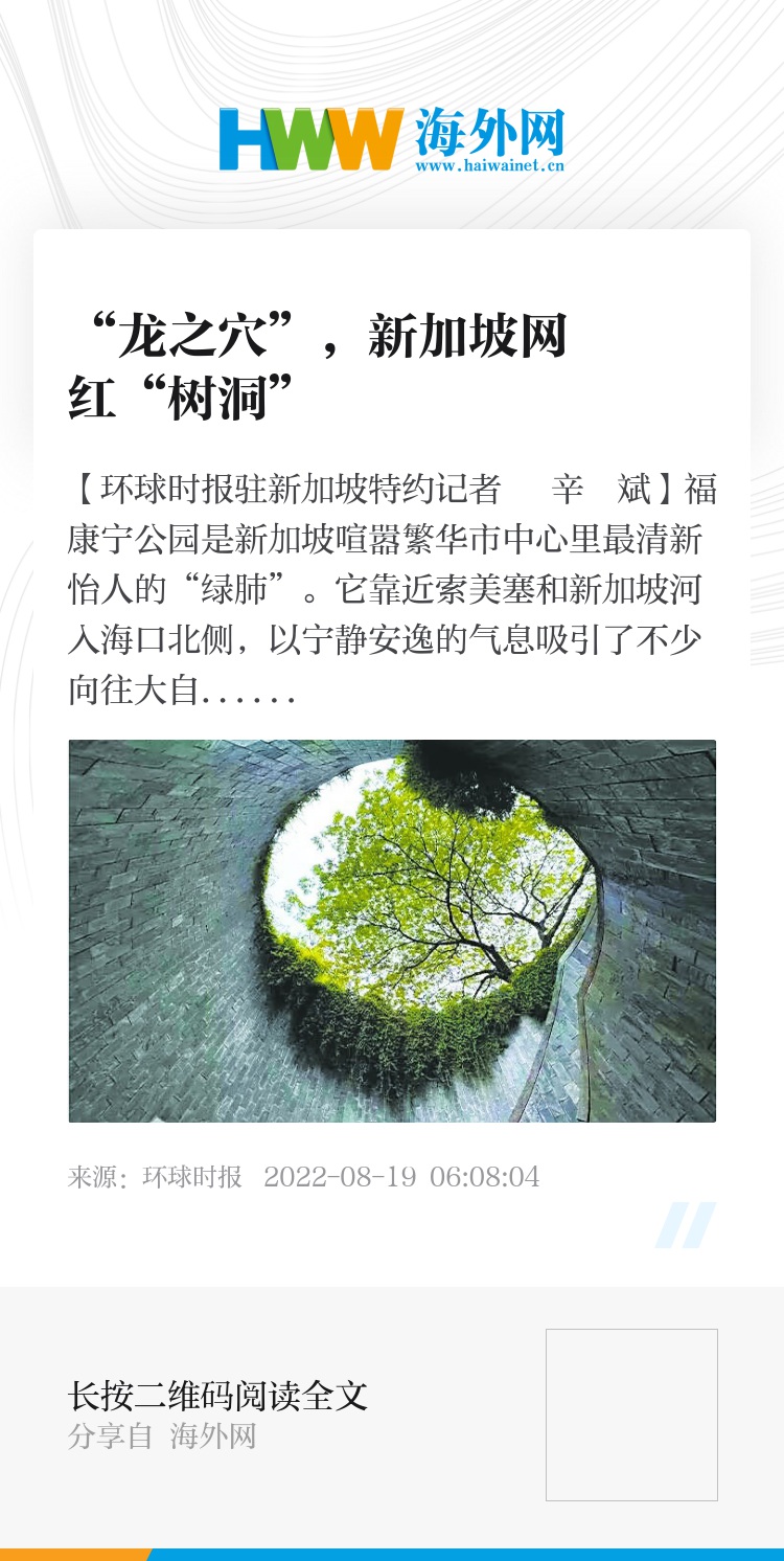 【环球时报驻新加坡特约记者 辛 斌】福康宁公园是新加坡喧嚣繁华市中心里最清新怡人的“绿肺”。它靠近索美塞和新加坡河入海口北侧,以宁静安逸的气息吸引了不少向往大自然的游客。福康宁公园的福康宁山海拔只有60米,却有制高点的优势。福康宁山的历史可以追溯到14世纪,据历史记载这里是当时苏丹皇室的所在地,之后还一度被当作军事堡垒。如今,山上还留有残余建筑,包括著名的打卡之地——“树洞”。