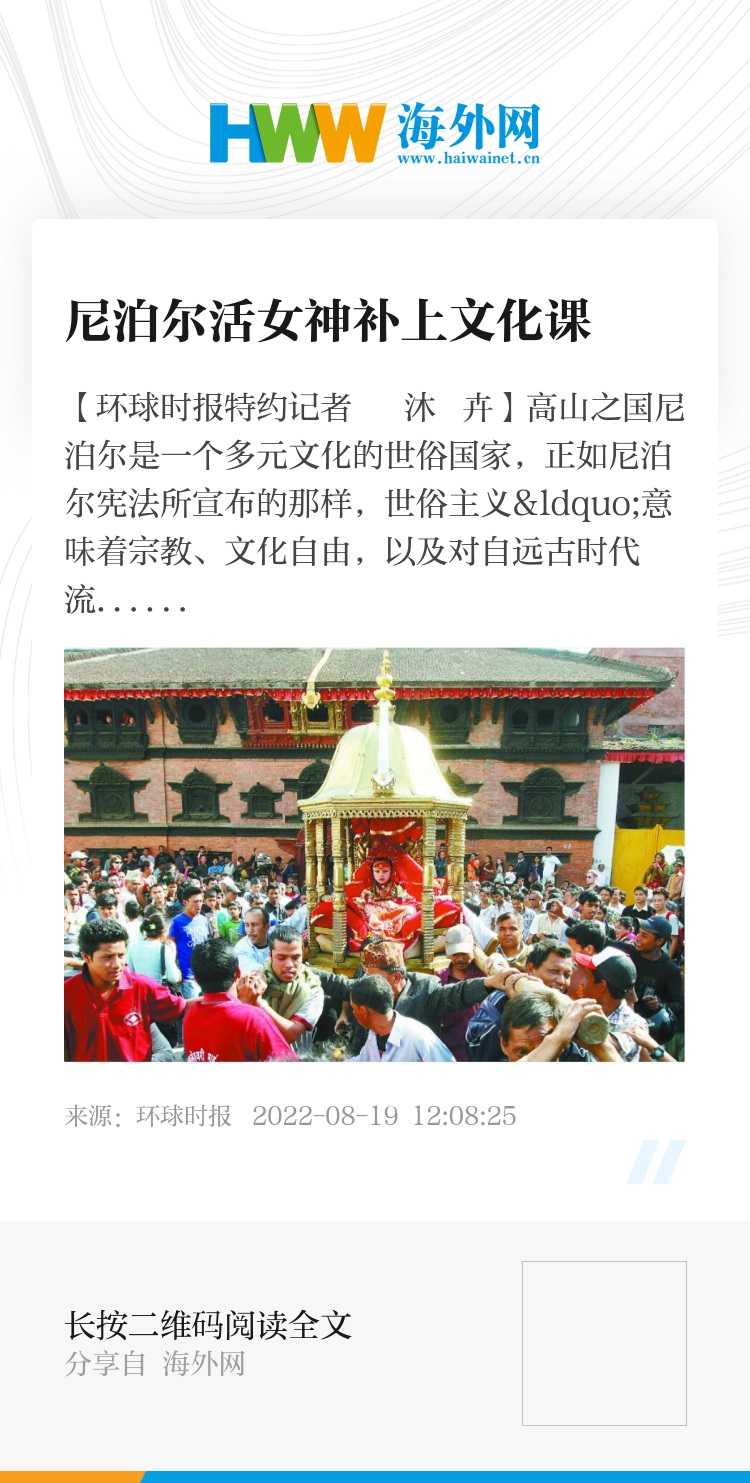 【环球时报特约记者 沐 卉】高山之国尼泊尔是一个多元文化的世俗国家,正如尼泊尔宪法所宣布的那样,世俗主义“意味着宗教、文化自由,以及对自远古时代流传下来的宗教和文化的保护”。尼泊尔境内有许多神庙,供奉着数不清的神,其中独一无二的便是会呼吸的“活女神”库玛丽(Kumari Devi),一个被神化的年轻女孩。