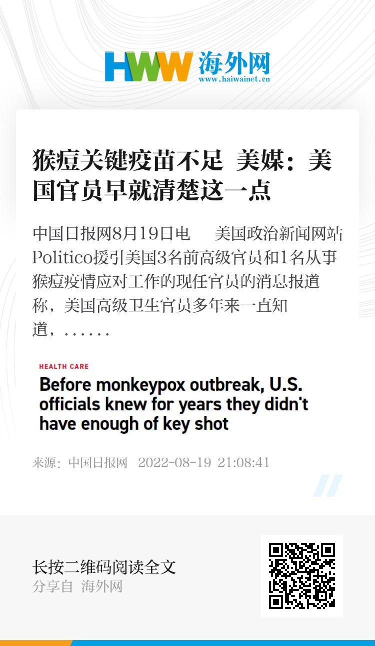 中国日报网8月19日电 美国政治新闻网站Politico援引美国3名前高级官员和1名从事猴痘疫情应对工作的现任官员的消息报道称,美国高级卫生官员多年来一直知道,美国的国家战略储备没有足够剂量的天花疫苗,而天花疫苗是目前抗击猴痘的关键。
