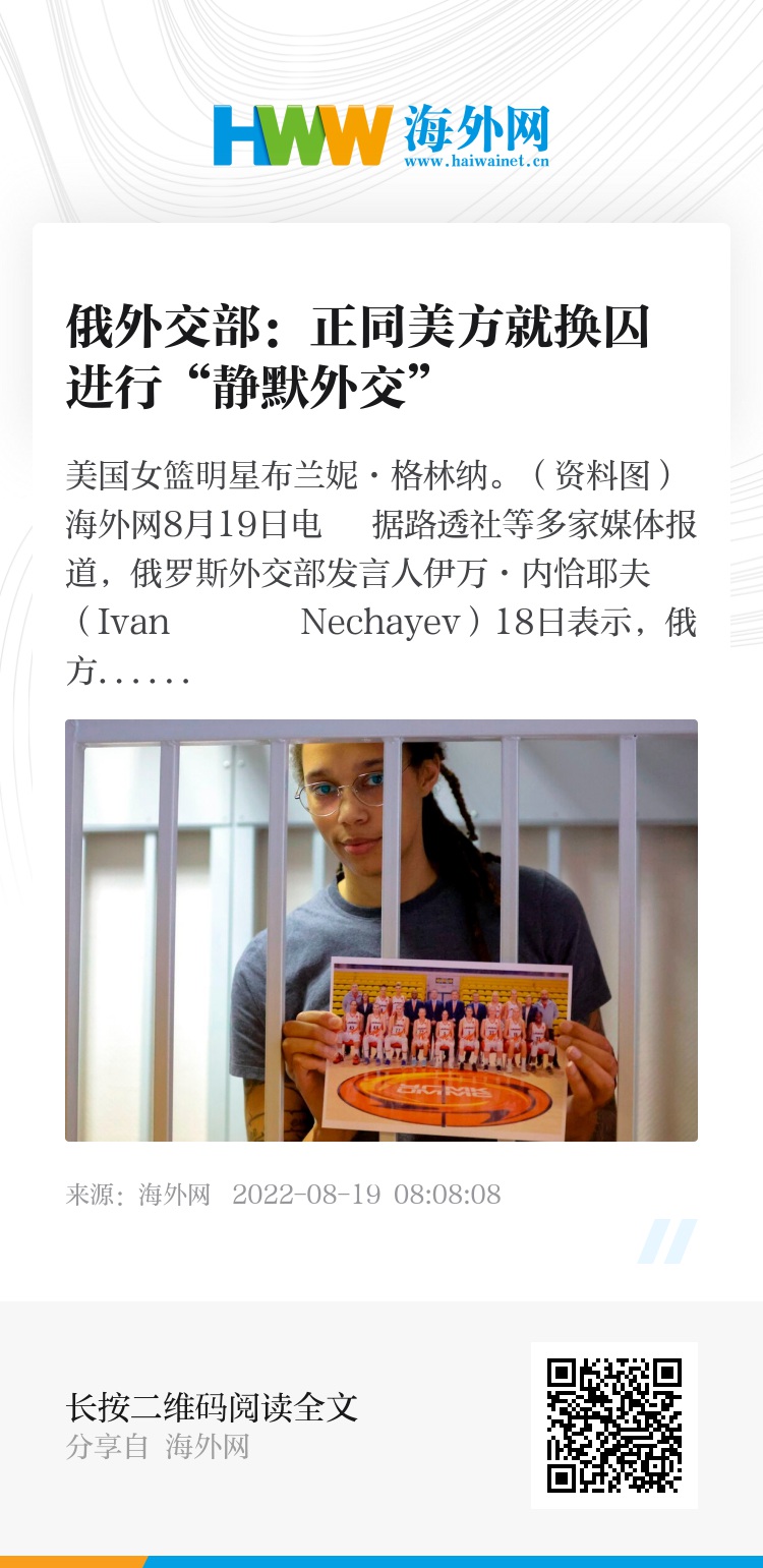 海外网8月19日电 据路透社等多家媒体报道,俄罗斯外交部发言人伊万·内恰耶夫(Ivan Nechayev)18日表示,俄方正与美国就潜在的囚犯交换进行“静默外交”,被交换者包括美国女篮明星布兰妮·格林纳(Brittney Griner)。
