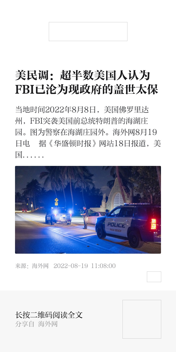 海外网8月19日电 据《华盛顿时报》网站18日报道,美国民调机构拉斯穆森报告(Rasmussen Reports)最新民调显示,超半数的美国人赞同联邦调查局(FBI)已沦为现任美国政府“盖世太保”的说法。
