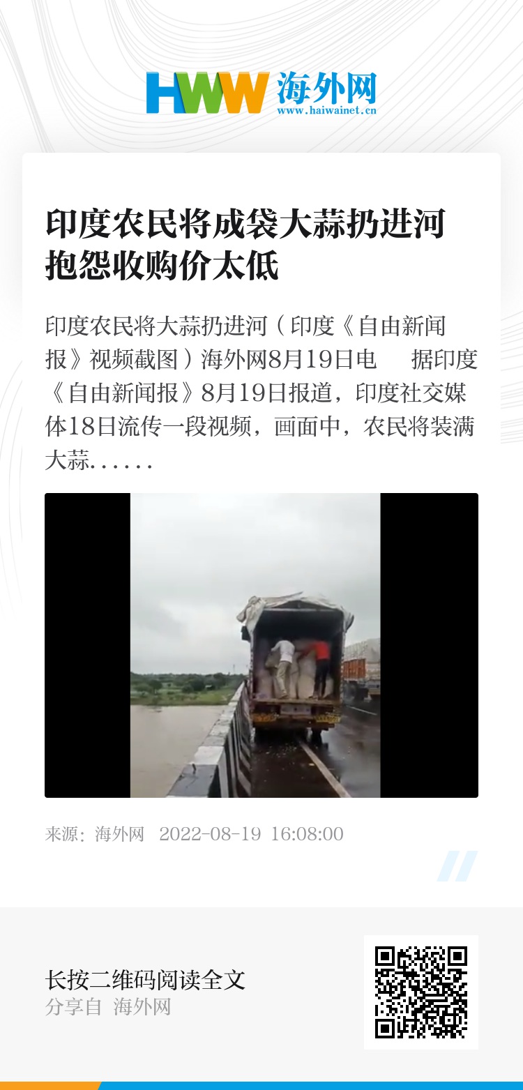 海外网8月19日电 据印度《自由新闻报》8月19日报道,印度社交媒体18日流传一段视频,画面中,农民将装满大蒜的麻袋扔进河里。报道称,这是由近期大蒜收购价过低引发的。