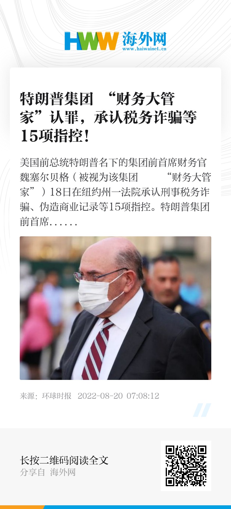 美国前总统特朗普名下的集团前首席财务官魏塞尔贝格(被视为该集团 “财务大管家”)18日在纽约州一法院承认刑事税务诈骗、伪造商业记录等15项指控。