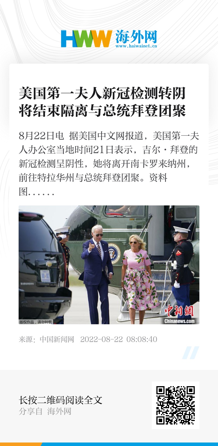 中新网8月22日电 据美国中文网报道,美国第一夫人办公室当地时间21日表示,吉尔·拜登的新冠检测呈阴性,她将离开南卡罗来纳州,前往特拉华州与总统拜登团聚。