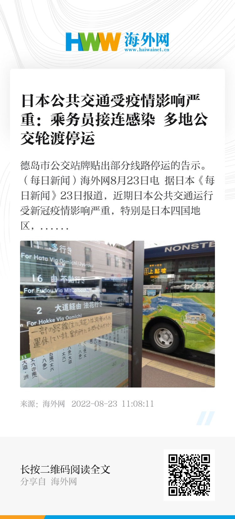 最近,日本德岛市德岛公交营业所的7名司机因感染新冠或成为密接人员,被迫居家隔离,这导致从德岛站发车的市内7条公交路线自20日起停运或减少班次。高知市也自9日起,临时减少了高知龙马机场和高知车站往返大巴的班次。相关部门称,他们共有约200名乘务员,其中数人因感染新冠病毒无法出勤,为保证市区日常公交线路的正常运转,不得不减少机场线大巴班车。