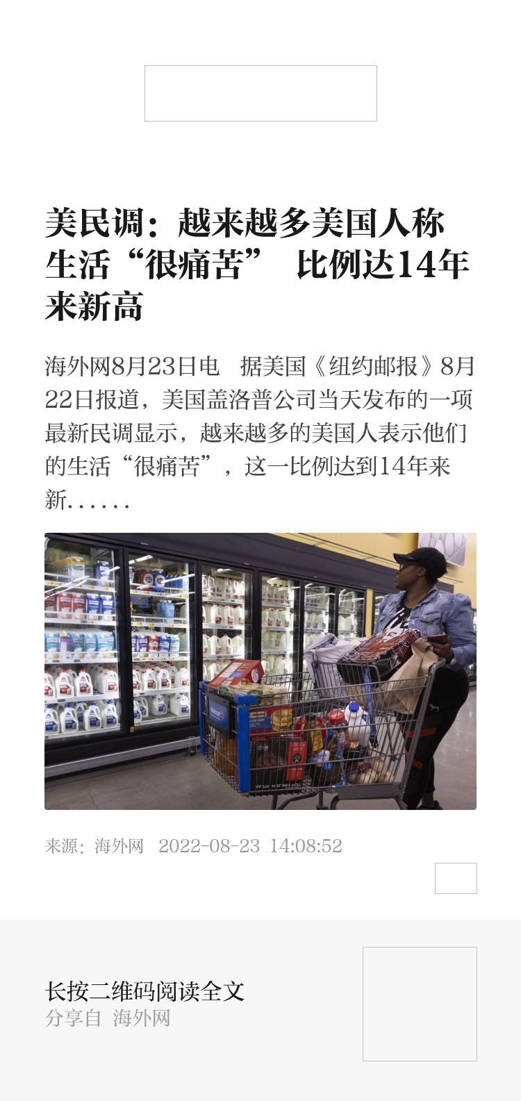盖洛普表示,该调查结果与受访者的收入息息相关,经济状况可能是导致民众打分下滑的主要因素。该公司称,创纪录的通胀对美国民众的钱包和福祉造成了损害。尽管7月美国新增了超52万就业岗位,仍不敌持续高通胀率造成的负面影响,这使得盖洛普经济信心指数达到2009年“大衰退”以来的新低。(海外网/张霓 实习编译/汪瑞琪)