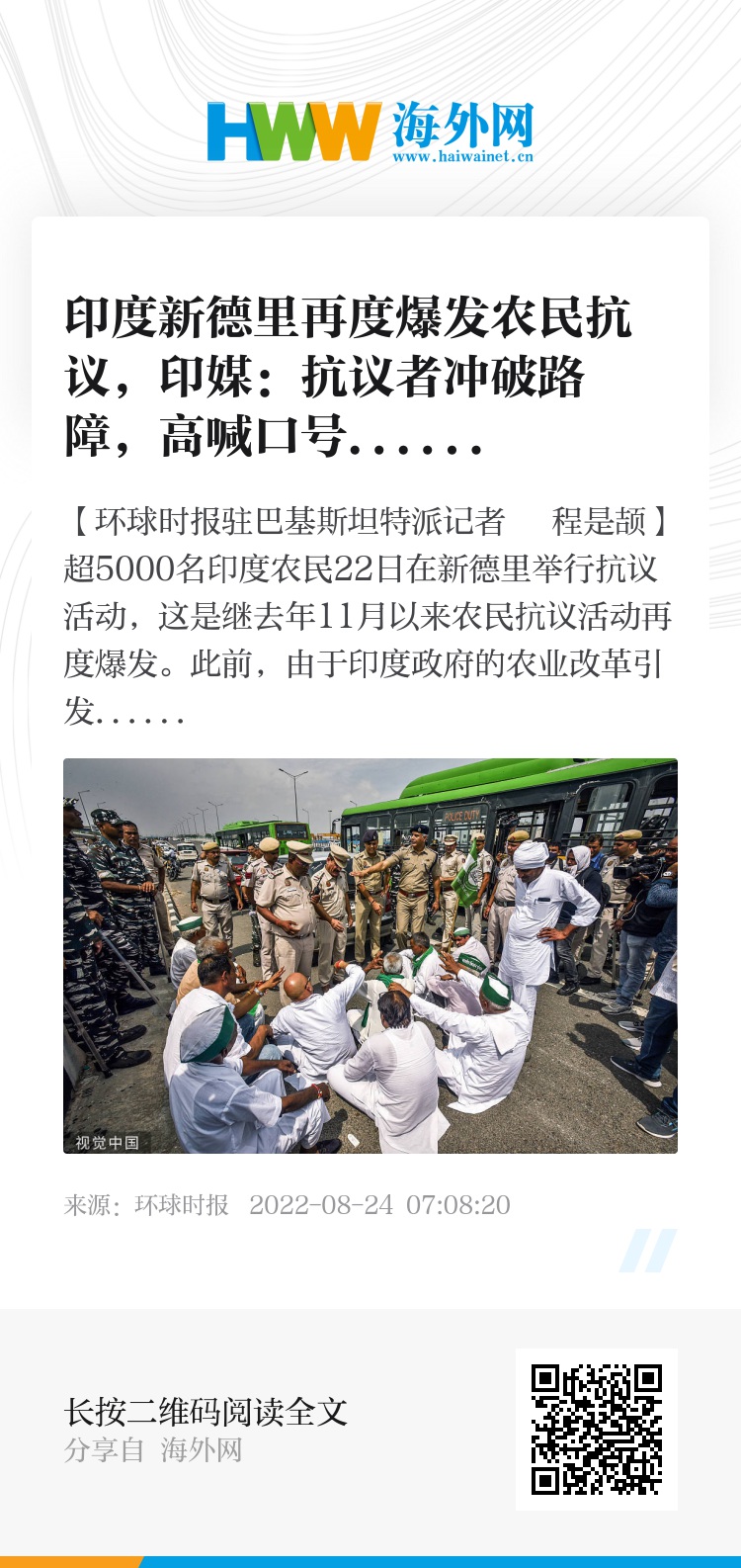 【环球时报驻巴基斯坦特派记者 程是颉】超5000名印度农民22日在新德里举行抗议活动,这是继去年11月以来农民抗议活动再度爆发。此前,由于印度政府的农业改革引发争议,印度农民发起持续一年多的全国性抗议活动。