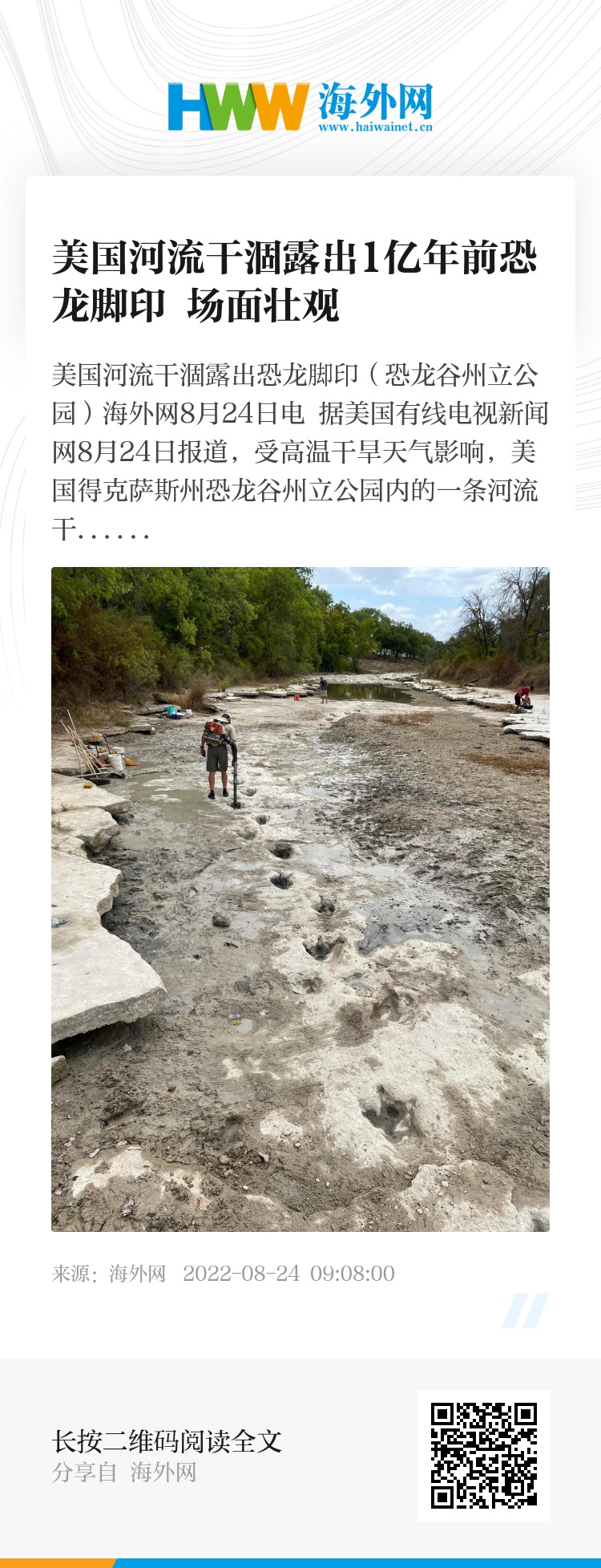海外网8月24日电 据美国有线电视新闻网8月24日报道,受高温干旱天气影响,美国得克萨斯州恐龙谷州立公园内的一条河流干涸,大量恐龙足迹化石重见天日,其中最古老的可以追溯到1.13亿年前。