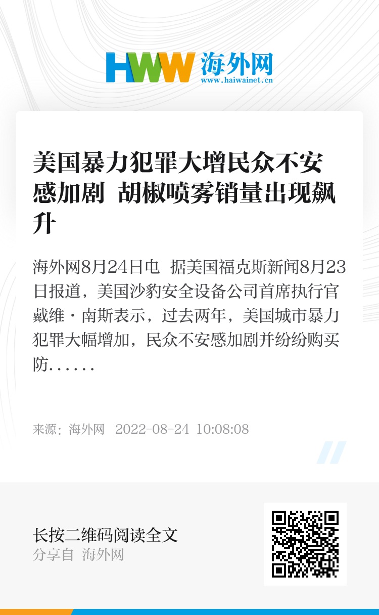 海外网8月24日电 据美国福克斯新闻8月23日报道,美国沙豹安全设备公司首席执行官戴维·南斯表示,过去两年,美国城市暴力犯罪大幅增加,民众不安感加剧并纷纷购买防身自卫产品,胡椒喷雾的销量一度飙升。