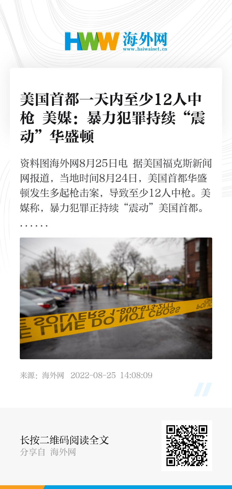 海外网8月25日电 据美国福克斯新闻网报道,当地时间8月24日,美国首都华盛顿发生多起枪击案,导致至少12人中枪。美媒称,暴力犯罪正持续“震动”美国首都。