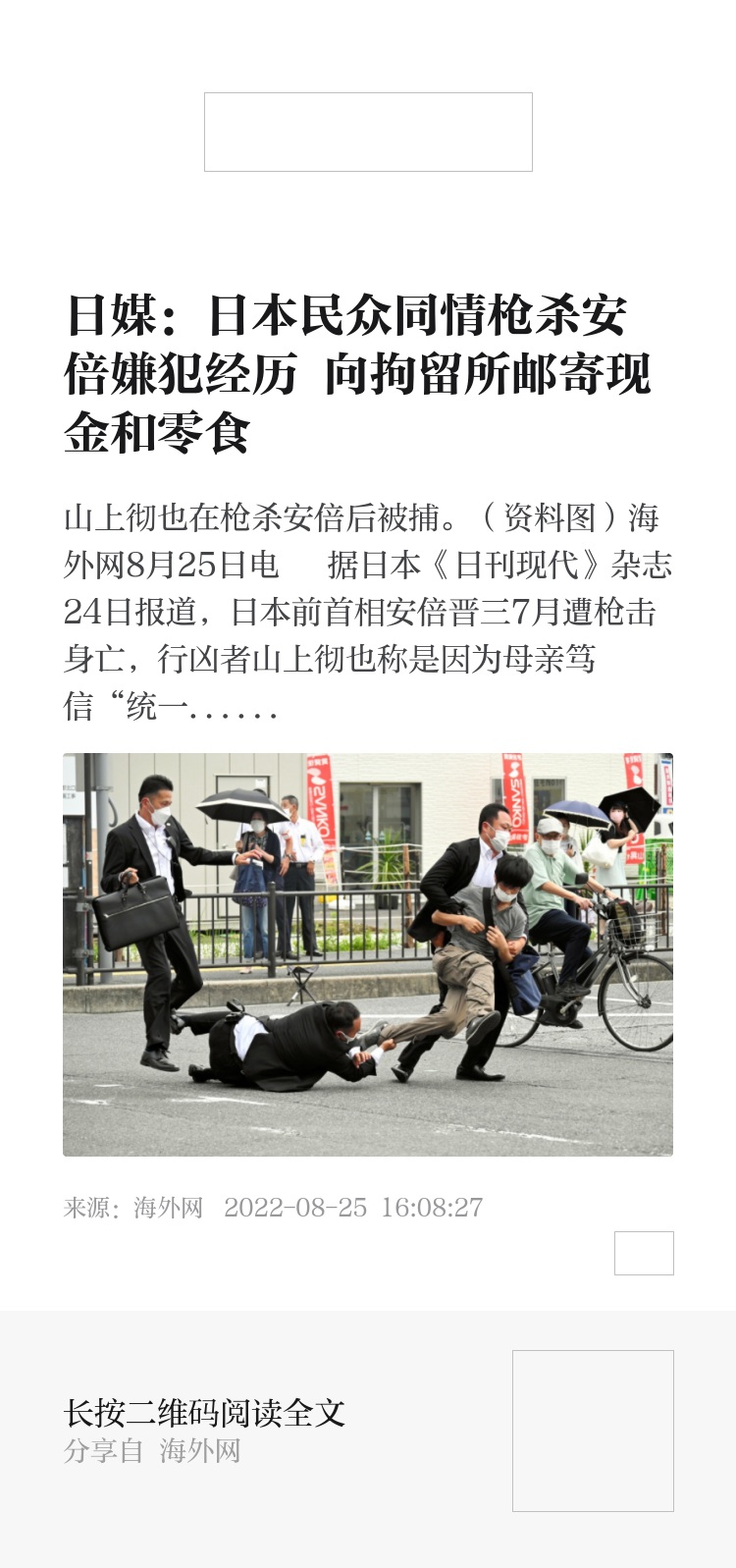 海外网8月25日电 据日本《日刊现代》杂志24日报道,日本前首相安倍晋三7月遭枪击身亡,行凶者山上彻也称是因为母亲笃信“统一教”导致家中一团混乱,加上认为安倍与该教会有关,才会犯下罪行。随着山上的经历逐渐曝光,他获得了越来越多的同情,还收到了日本民众捐赠的金钱、零食等物品。