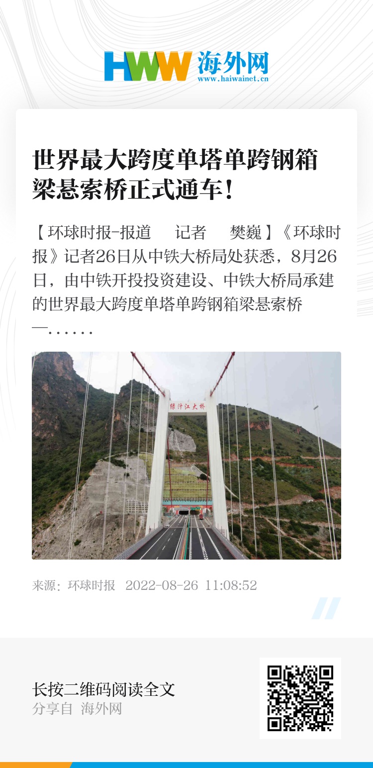 【环球时报-环球网报道 记者 樊巍】《环球时报》记者26日从中铁大桥局处获悉,8月26日,由中铁开投投资建设、中铁大桥局承建的世界最大跨度单塔单跨钢箱梁悬索桥——云南玉楚高速绿汁江大桥顺利通车!