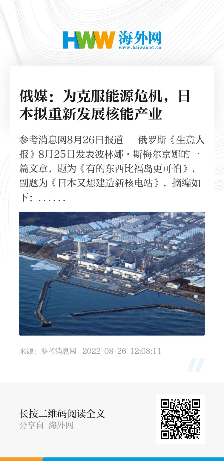 参考消息网8月26日报道 俄罗斯《生意人报》8月25日发表波林娜·斯梅尔京娜的一篇文章,题为《有的东西比福岛更可怕》,副题为《日本又想建造新核电站》,摘编如下: