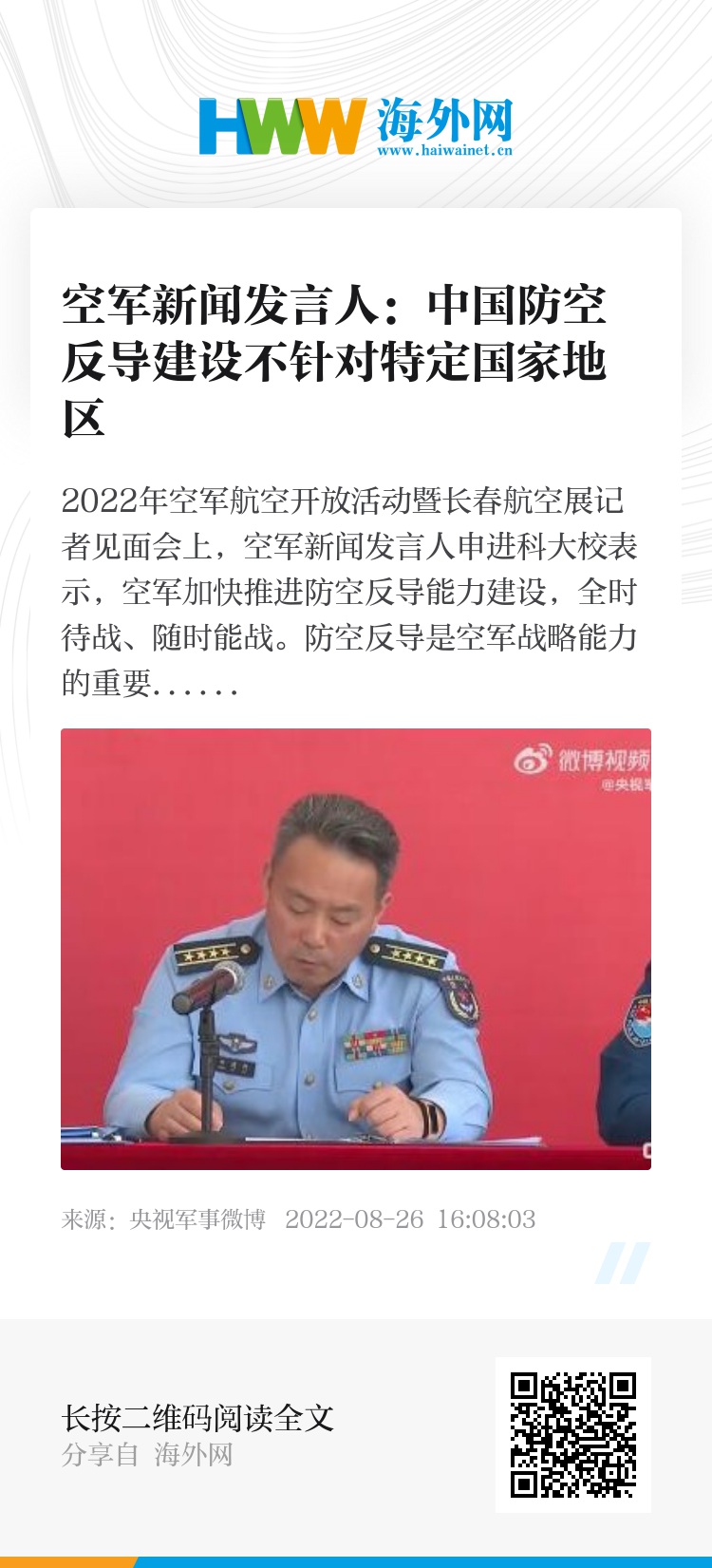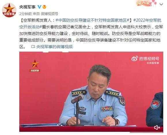 2022年空军航空开放活动暨长春航空展记者见面会上,空军新闻发言人申进科大校表示,空军加快推进防空反导能力建设,全时待战、随时能战。防空反导是空军战略能力的重要组成部分。需要说明的是,中国防空反导装备建设不针对任何特定国家和地区。