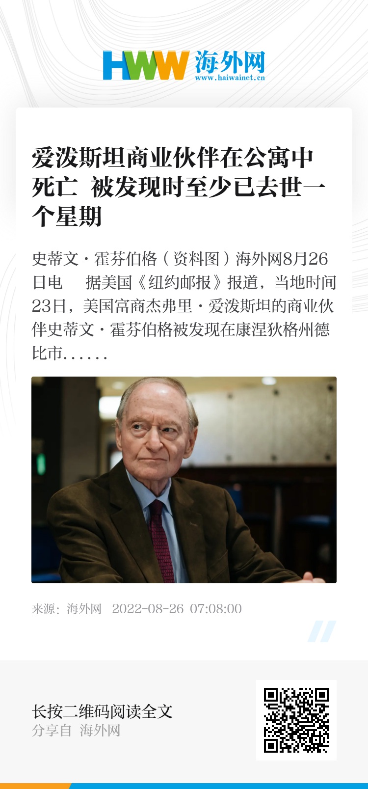 海外网8月26日电 据美国《纽约邮报》报道,当地时间23日,美国富商杰弗里·爱泼斯坦的商业伙伴史蒂文·霍芬伯格被发现在康涅狄格州德比市的公寓中死亡,警方认为霍芬伯格至少已去世一个星期。