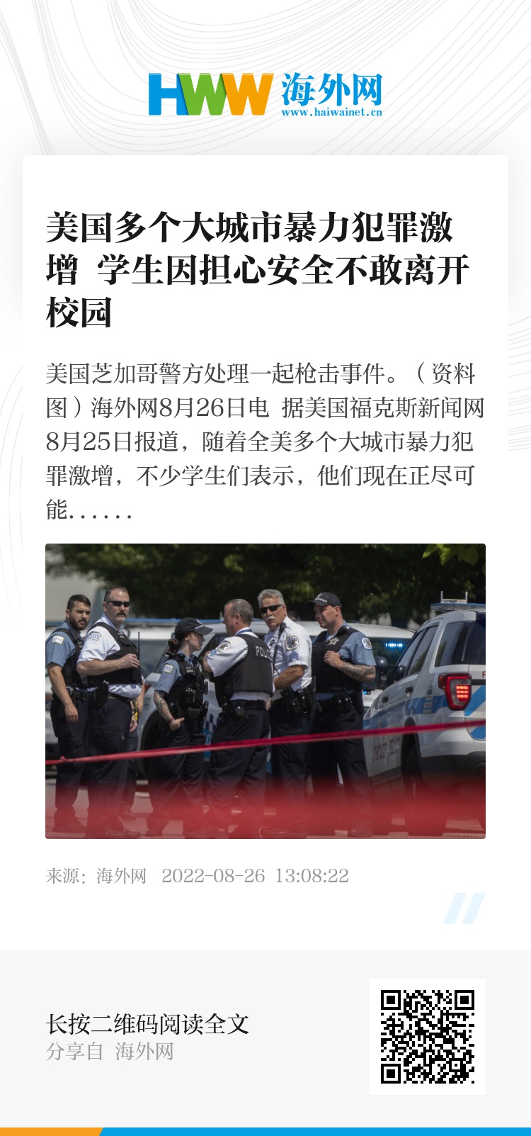 海外网8月26日电 据美国福克斯新闻网8月25日报道,随着全美多个大城市暴力犯罪激增,不少学生们表示,他们现在正尽可能地避免离开校园。