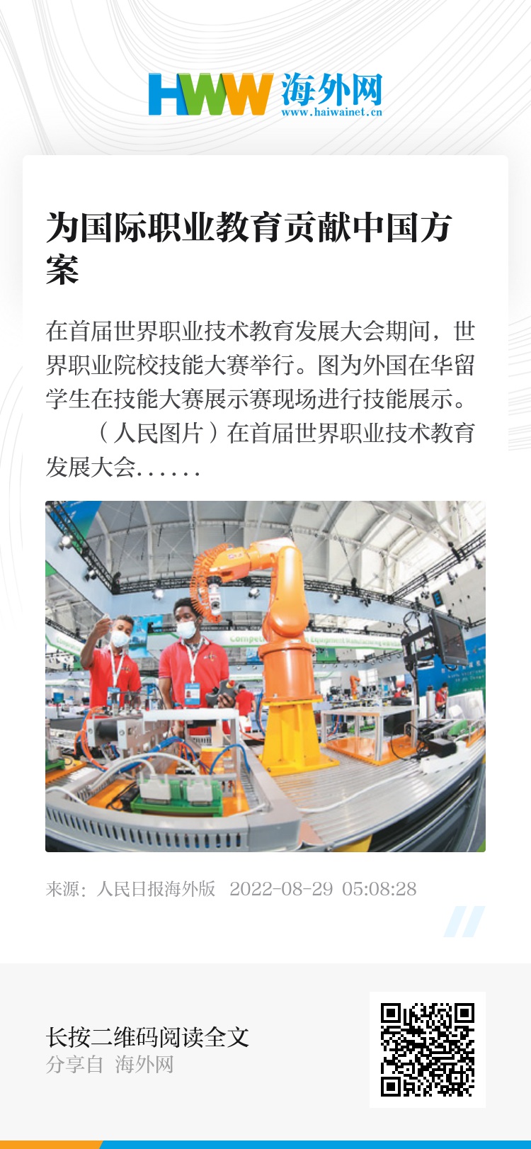 白皮书强调,中国将一以贯之地坚持对外开放,以国际视野兼容并蓄,以国际胸怀开放合作,深度融入世界职业教育改革发展潮流,积极构建国际化交流平台,致力消除贫困、增加就业、改善民生,在力所能及的范围内承担更多责任义务,为全球教育治理贡献中国方案,为推动构建人类命运共同体贡献教育力量。“我将落实习近平总书记在世界职业技术教育发展大会贺信要求,与团队一道共同编写配网带电作业机器人培训课程,希望借助鲁班工坊,将配网带电作业机器人的技术推广到‘一带一路’沿线国家,为相关国家的电网安全和供电质量提升出一份力”。张黎明说。(本报记者 武少民 李家鼎)