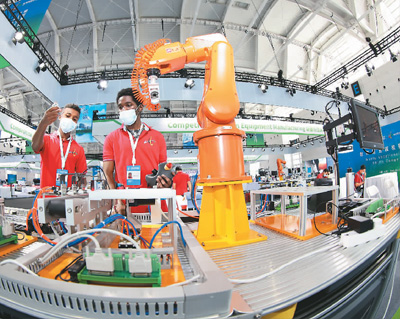 在首届世界职业技术教育发展大会期间,世界职业院校技能大赛举行。图为外国在华留学生在技能大赛展示赛现场进行技能展示。