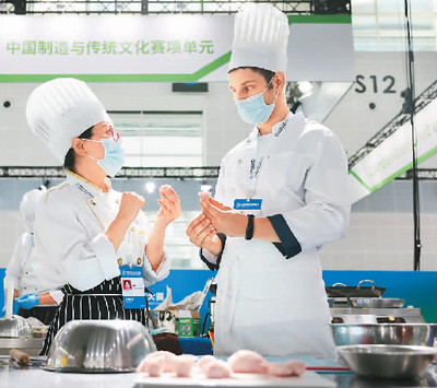在首届世界职业技术教育发展大会期间,世界职业院校技能大赛举行。图为一名中国学生与外国同伴在大赛展示赛现场交流中式烹饪技能。