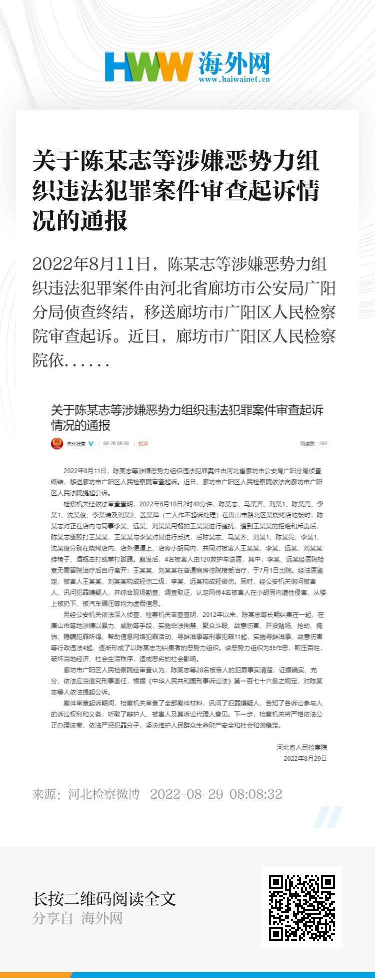 2022年8月11日,陈某志等涉嫌恶势力组织违法犯罪案件由河北省廊坊市公安局广阳分局侦查终结,移送廊坊市广阳区人民检察院审查起诉。近日,廊坊市广阳区人民检察院依法向廊坊市广阳区人民法院提起公诉。