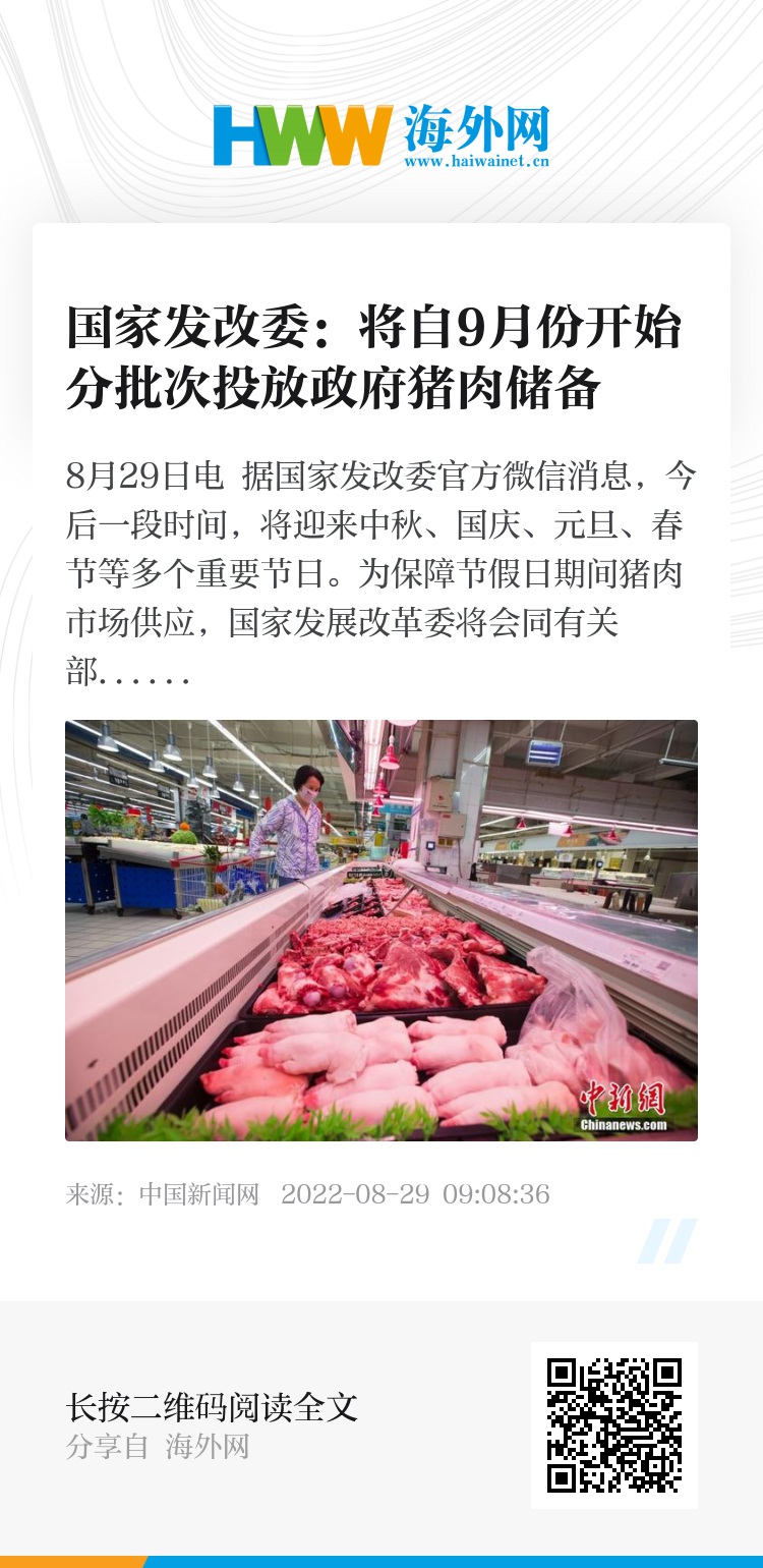中新网8月29日电 据国家发改委官方微信消息,今后一段时间,将迎来中秋、国庆、元旦、春节等多个重要节日。为保障节假日期间猪肉市场供应,国家发展改革委将会同有关部门自9月份开始分批次投放政府猪肉储备,并指导地方联动投放储备。同时密切关注市场动态,维护市场正常秩序。