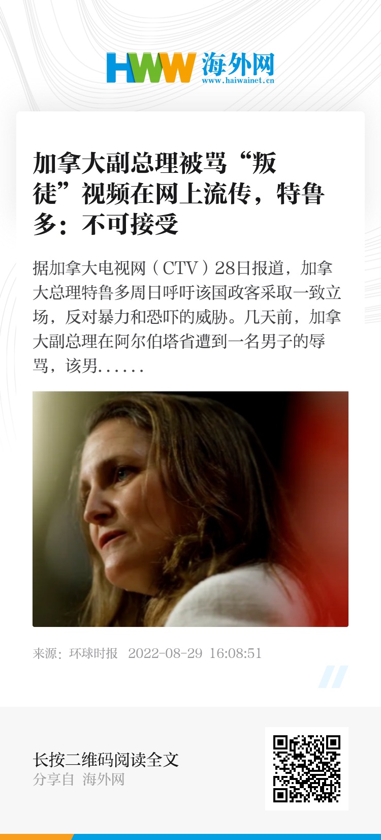 据加拿大广播公司(CBC)报道,社交媒体上广泛流传的一段视频显示,加拿大副总理兼财政部长克里斯蒂娅·弗里兰(Chrystia Freeland)在大草原城的市政厅遭人辱骂。当时她正走向一部电梯,一名男子对她大喊大叫,称她为“叛徒”,并让她离开阿尔伯塔省。