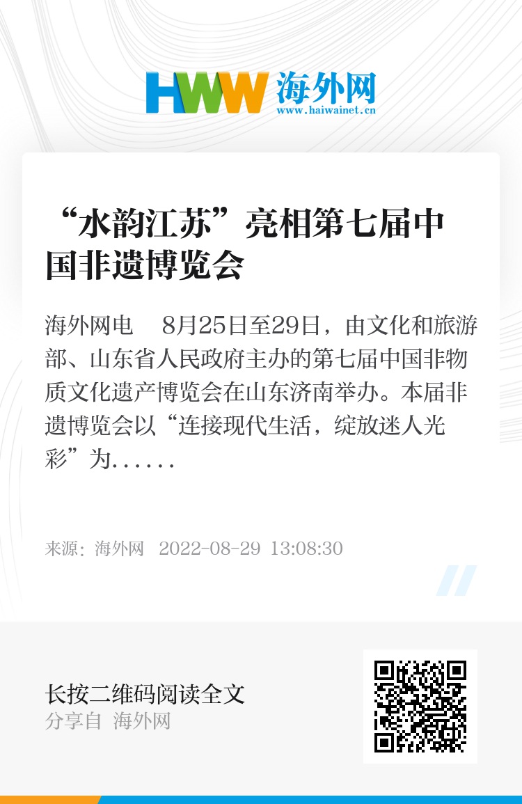海外网电 8月25日至29日,由文化和旅游部、山东省人民政府主办的第七届中国非物质文化遗产博览会在山东济南举办。本届非遗博览会以“连接现代生活,绽放迷人光彩”为主题,引入主宾省参与机制,运河沿线8省市共同举办“欣欣向荣”大运河沿线非遗展。其中“水韵江苏”非遗主题展围绕大运河国家文化公园建设重大战略,展出江苏24个非遗代表性项目,情境化描绘了运河沿线“同宗同源”又“和而不同”的风土人情,展现大运河江苏段传统文化的丰富内涵及其对经济社会发展的历史贡献,充分彰显非遗创造性转化、创新性发展的活力与成果,满足人民群众对美好生活的向往,助力谱写“强富美高”新江苏现代化建设新篇章。