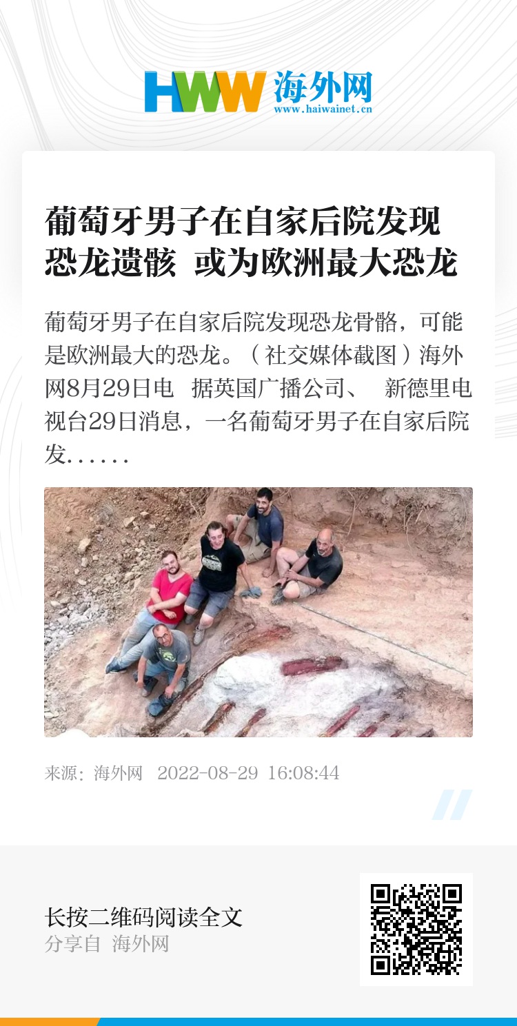 海外网8月29日电 据英国广播公司、 新德里电视台29日消息,一名葡萄牙男子在自家后院发现了恐龙骨头。科研人员认为,这些遗骸被鉴定为蜥脚类恐龙,这可能是欧洲有史以来发现的最大型恐龙。