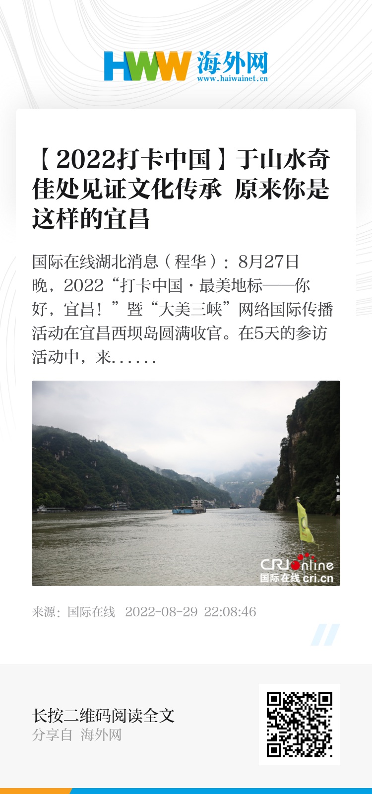短短5天的行程,外国网红真切感受到峡江的今昔变化、长江文化的保护与传承,见证了一个开放、多元、活力的宜昌。“有朋自远方来,不亦乐乎!”宜昌欢迎更多海内外宾客,一起欣赏山水美景,感受长江文化的多彩浪漫,领略峡江民俗风情,体验“壮美三峡、诗画宜昌”的魅力与风采。