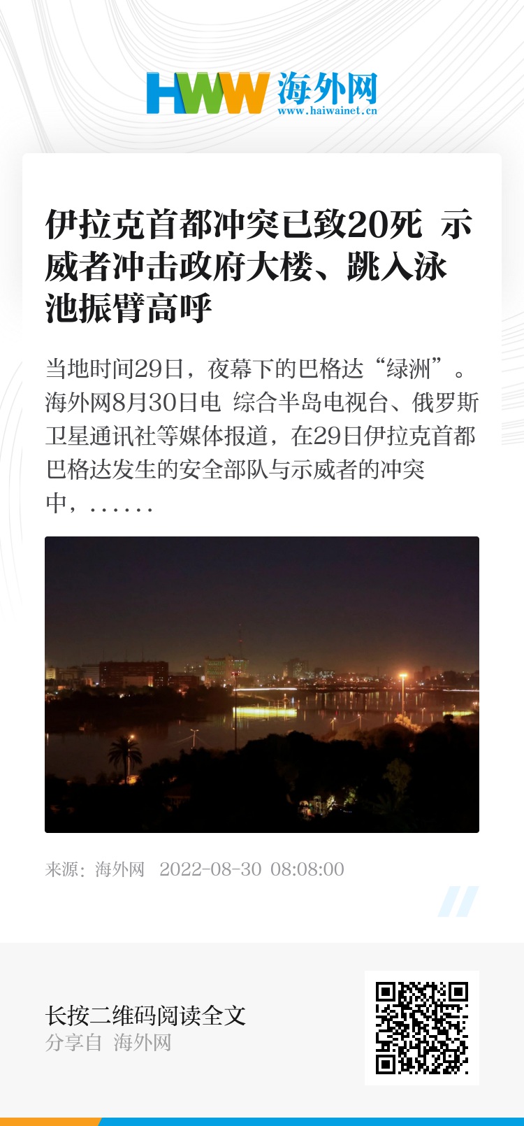 当天早些时候,伊拉克什叶派宗教领袖萨德尔在社交媒体发文宣布退休,他领导的“萨德尔运动”相关机构也将关闭。其支持者随后在巴格达“绿区”推倒路障,强闯包括共和国宫在内的政府大楼。