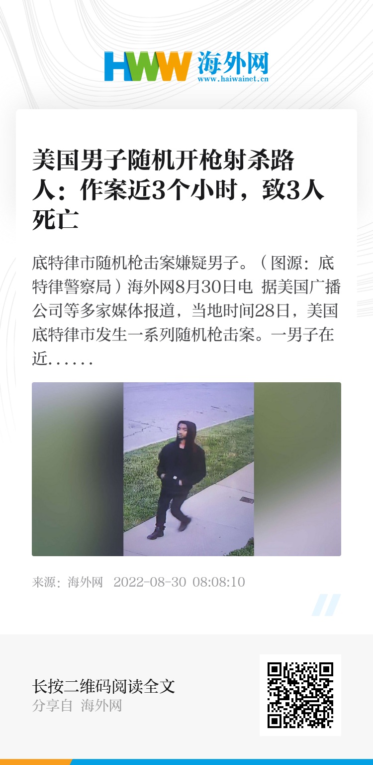 海外网8月30日电 据美国广播公司等多家媒体报道,当地时间28日,美国底特律市发生一系列随机枪击案。一男子在近3小时里陆续向路人随机开枪,致3人死亡。