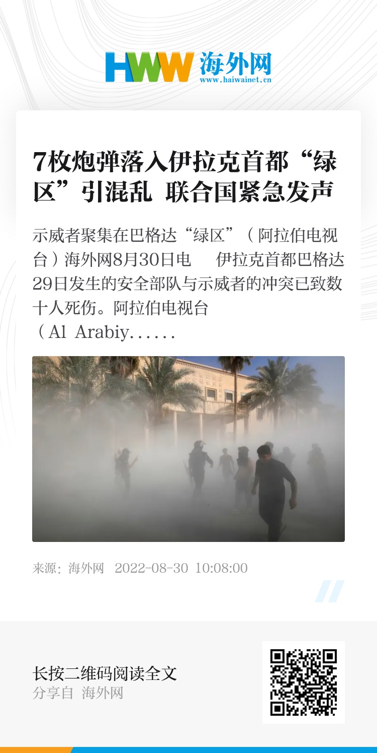 海外网8月30日电 伊拉克首都巴格达29日发生的安全部队与示威者的冲突已致数十人死伤。阿拉伯电视台(Al Arabiya)援引伊拉克安全部门人员的话说,当天至少有7枚炮弹落入“绿区”,局势混乱。