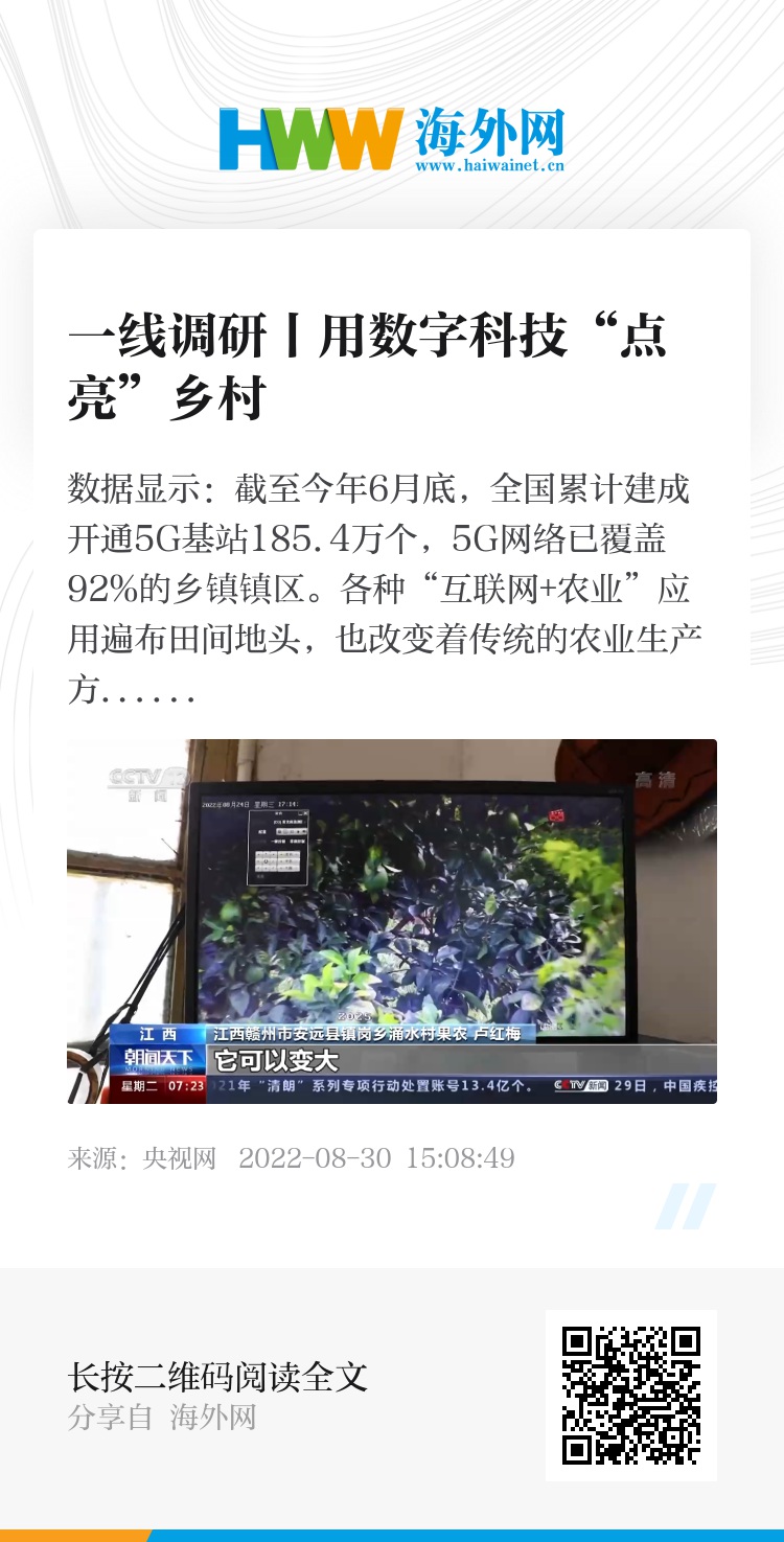数据显示:截至今年6月底,全国累计建成开通5G基站185.4万个,5G网络已覆盖92%的乡镇镇区。各种“互联网+农业”应用遍布田间地头,也改变着传统的农业生产方式。在江西赣州的脐橙主产区,果农们告诉记者,现在种脐橙要天天和各种数据打交道。