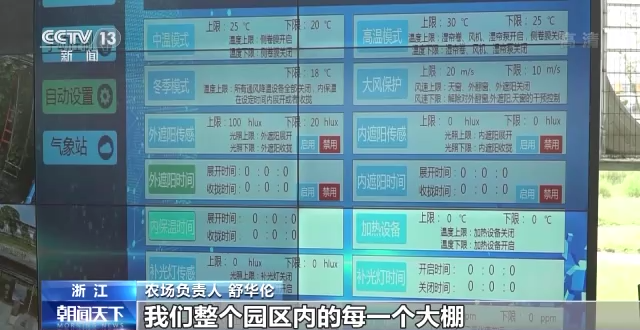 农场负责人 舒华伦:我们的风机打开了,当时我温度在室内设置了30度,室内温度到30度就自动打开了风机,包括遮阳网,到25度以下它就自动关闭了。